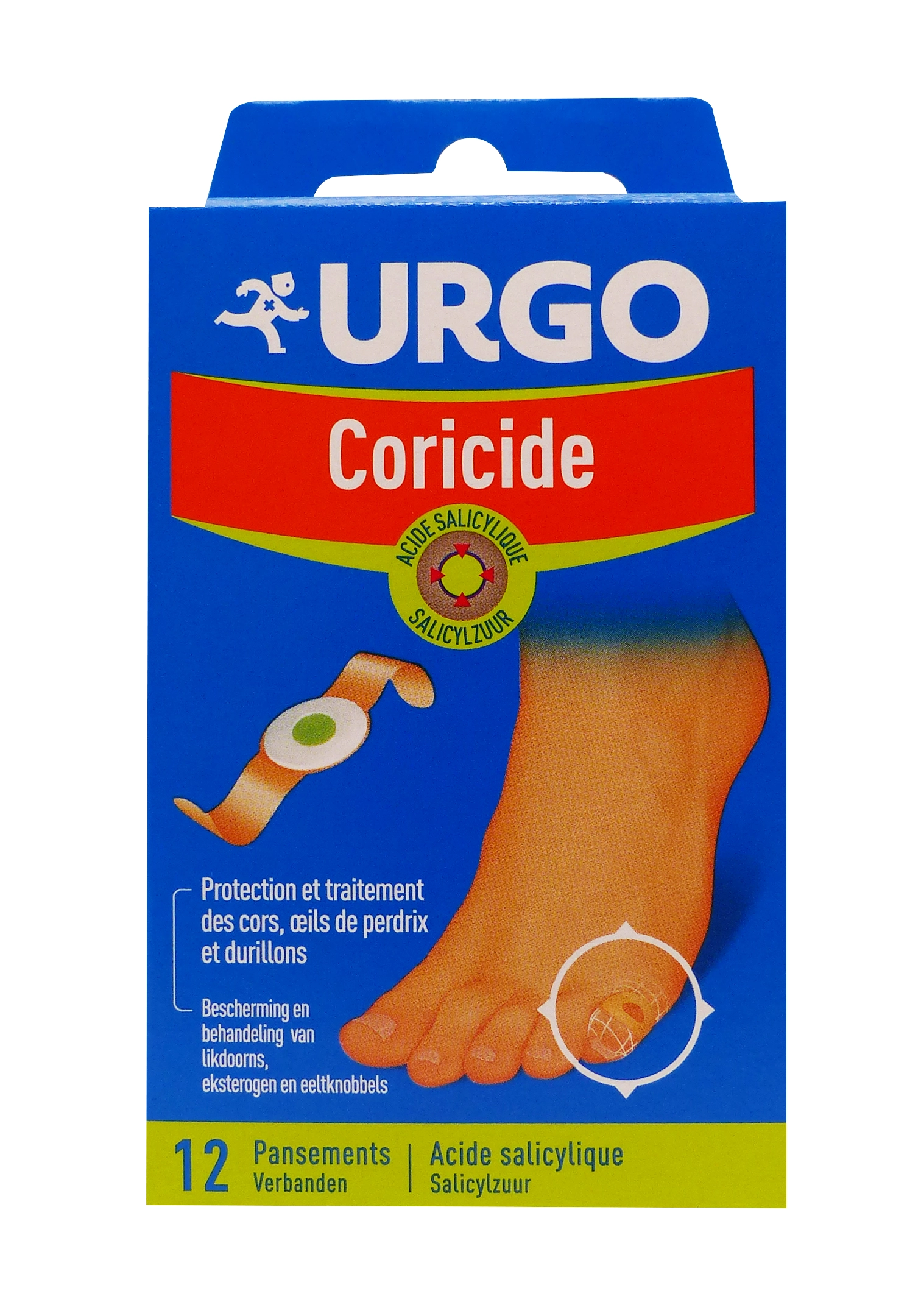 Urgo Coricide 12 pansements sont des dispositifs médicaux destinés au traitement local d’appoint des cors, œils de perdrix et durillons, ces lésions cutanées dues à des pressions ou frottements répétés sur la plante du pied. Chaque pansement est composé d’une pastille d’acide salicylique qui agit directement sur la callosité, en la ramollissant pour faciliter son élimination, et d’un disque protecteur qui limite les pressions douloureuses et protège la zone sensible contre les frottements de la chaussure.