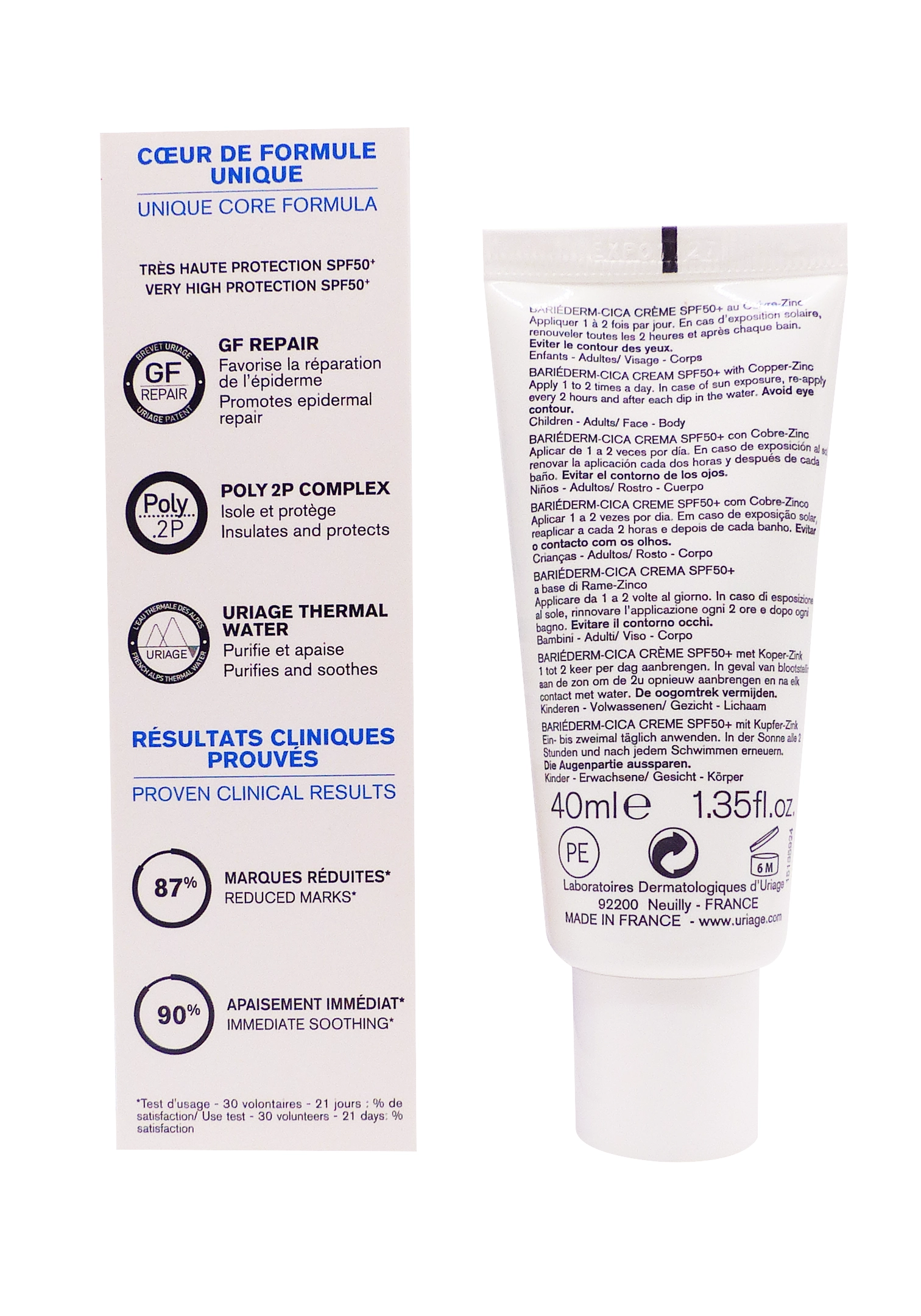 Uriage Bariéderm-CICA Crème Réparatrice Protectrice 40 ml est une crème multi-usages pour toute la famille, conçue pour réparer et protéger les peaux fragilisées, irritées ou abîmées (petits bobos, échauffements, post-actes dermo-esthétiques, zones de grattage). Elle forme un film protecteur non occlusif qui isole des agressions extérieures, apaise les irritations et favorise la réparation épidermique grâce à une combinaison d’Eau Thermale d’Uriage, cuivre-zinc et complexes brevetés.