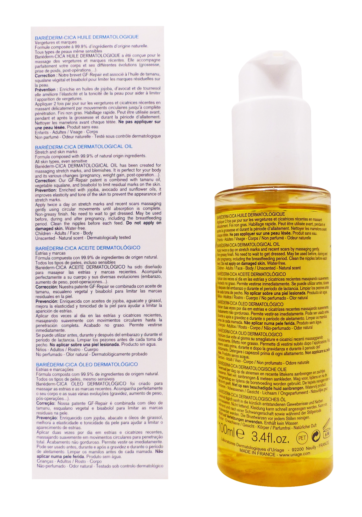 Uriage Bariéderm Dermatologique 100 ml est une huile dermatologique réparatrice et protectrice conçue pour prévenir et corriger les marques cutanées comme les vergetures, cicatrices et étirements, tout en nourrissant les peaux fragilisées de toute la famille. Formulée à 99% d’ingrédients d’origine naturelle, elle pénètre rapidement pour relipider le film hydrolipidique, améliorer l’élasticité et favoriser la régénération épidermique grâce à des huiles végétales et l’Eau Thermale d’Uriage.