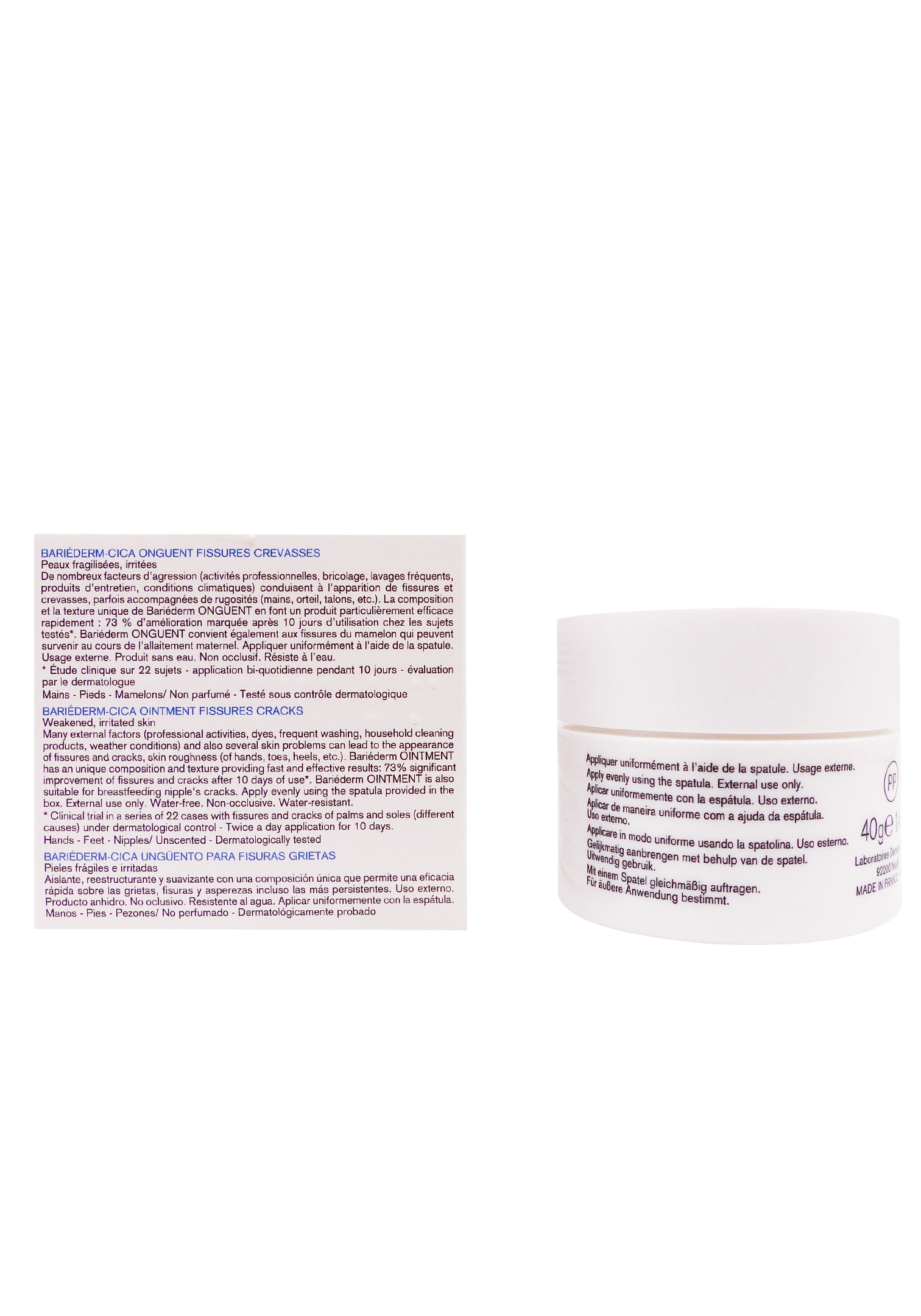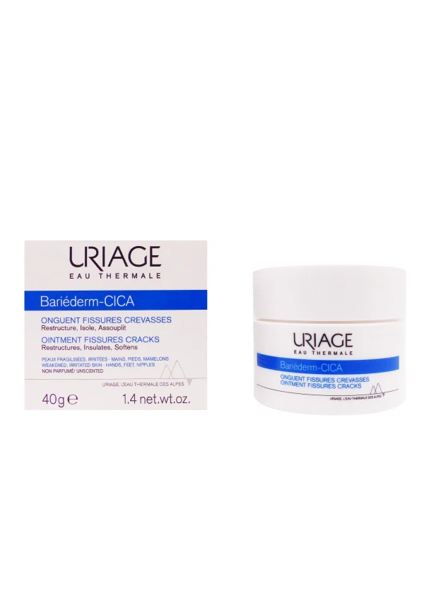 Uriage Bariéderm-CICA Onguent Fissures Crevasses 40 g est un onguent barrière souple et malléable, spécialement formulé pour isoler, réparer et assouplir les fissures et crevasses récentes ou anciennes sur les peaux fragilisées et irritées. Il cible particulièrement les zones sèches et rugueuses des mains, pieds (talons), mamelons (fissures d’allaitement) ou corps (coudes, genoux), en restaurant la barrière cutanée grâce au complexe breveté Poly-2P.