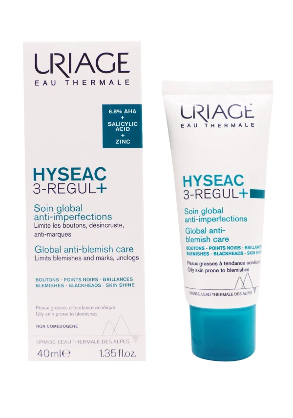 Uriage Hyséac 3-Régul+ Soin Global Anti-Imperfections 40 ml est un soin correcteur complet pour peaux grasses à mixtes à tendance acnéique, qui cible simultanément boutons, points noirs, brillances, pores dilatés, rougeurs et marques résiduelles. Grâce à sa technologie brevetée Microbiome associant 4 brevets (Endo Regul, TLR2 Regul, MPA Regul, Réglisse), il rééquilibre la flore cutanée perturbée par Cutibacterium acnes, le stress ou les hormones, pour une peau nette, matifiée et affinée avec une utilisation quotidienne.