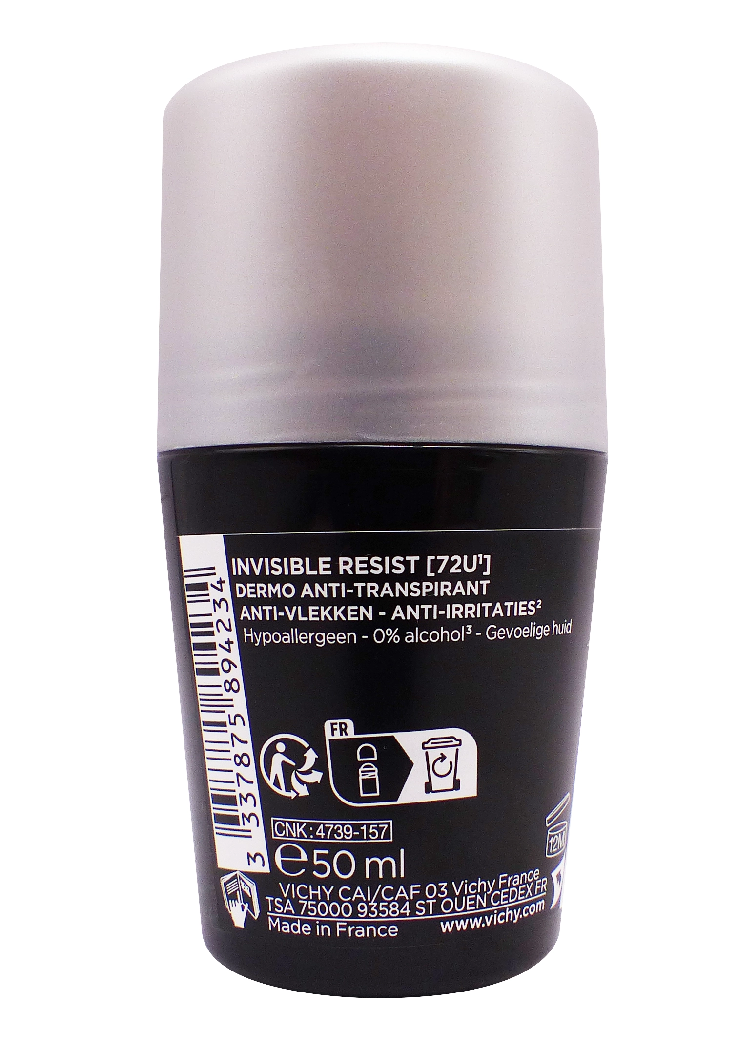 Vichy roll-on Homme détranspirant invisible résist 72h haute performance conçu pour les hommes à peaux sensibles. Sa technologie Invisi-Lock assure 72 heures de protection anti-humidité et anti-odeurs, tout en prévenant taches blanches/jaunes et irritations grâce à la perlite absorbante et une formule sans alcool.