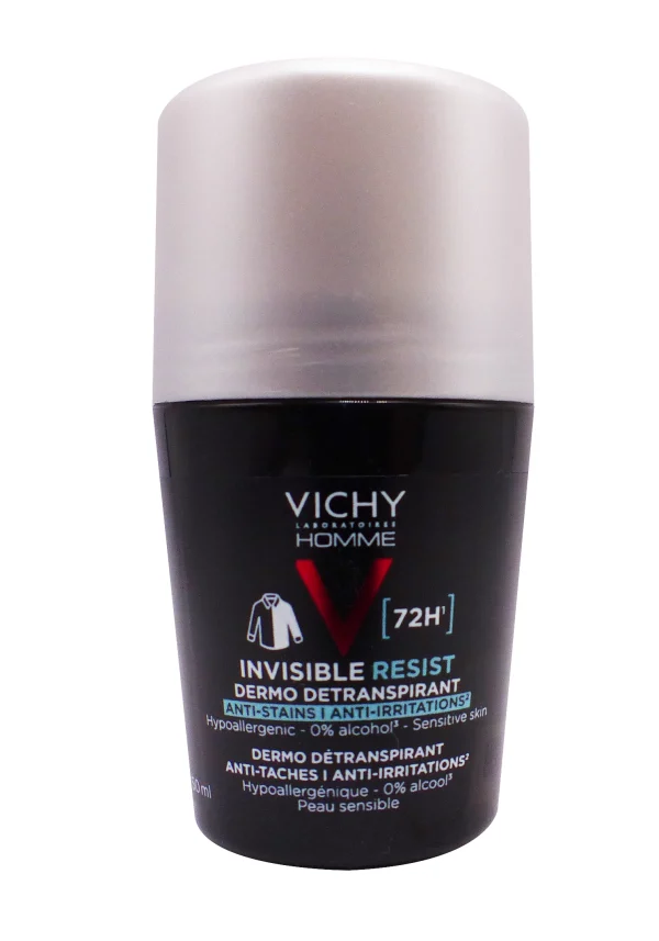 Vichy Homme Invisible Resist 72h roll-on invisible résist excelle par sa triple action anti-transpirante, anti-taches et anti-irritations, pour confort longue durée.