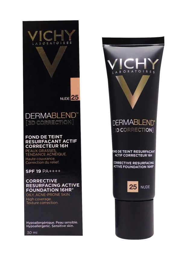 Vichy Dermablend 3D Teinte Nude 25 SPF 19, 30ml est un fond de teint correcteur haute couvrance spécialement conçu pour les peaux à imperfections, à tendance acnéique ou sensibles. Formulé par le Laboratoire Vichy, reconnu pour ses innovations dermatologiques, ce soin maquillage allie correction intense, unification du teint et protection solaire pour un résultat naturel, mat et durable. La teinte Nude 25 est idéale pour les carnations intermédiaires à dorées, offrant une couverture modulable et un fini mat.