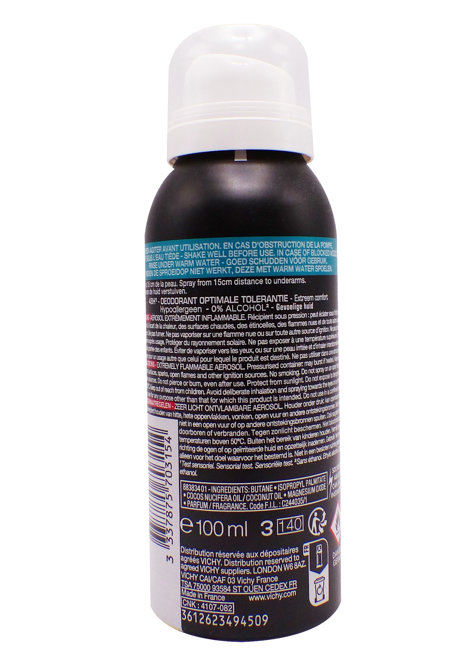 Le spray compressé Vichy Homme 100 ml hydrate et apaise les aisselles irritées avec de l’huile de coco, tout en neutralisant les bactéries responsables des odeurs.