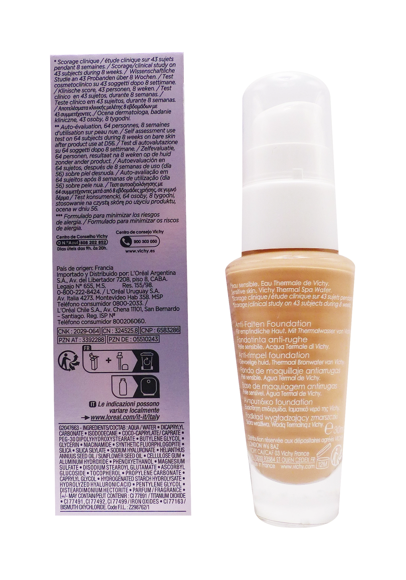 Sa formule contient du collagène, des actifs dermatologiques Vichy ainsi que de l’Eau Thermale Vichy apaisante et fortifiante, permettant de préserver la souplesse de la peau et de limiter la déshydratation. Non comédogène, hypoallergénique et testée sous contrôle dermatologique, cette base fluide est parfaitement tolérée par les peaux sensibles ou matures.
