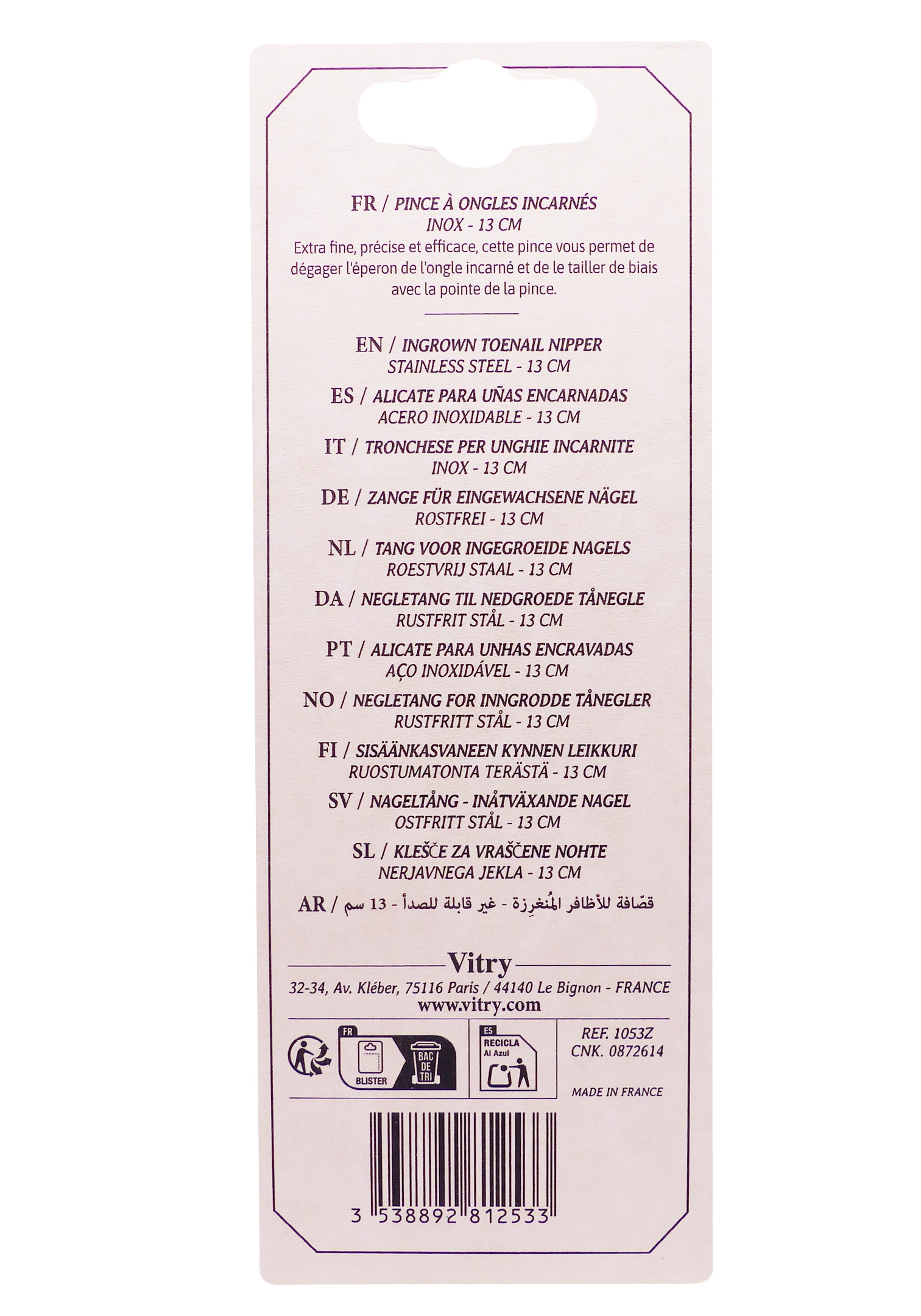Vitry pince à ongle incarnés 13 cm est un outil de pédicurie précis et robuste, pensé pour dégager l’éperon de l’ongle incarné et obtenir une coupe nette sur des ongles parfois épais et difficiles à travailler. Utilisée avec prudence, sur un pied propre et désinfecté, et associée à une coupe régulière des ongles droits, elle contribue à limiter l’inconfort lié aux onglesincarnés et à maintenir une bonne hygiène podologique.
