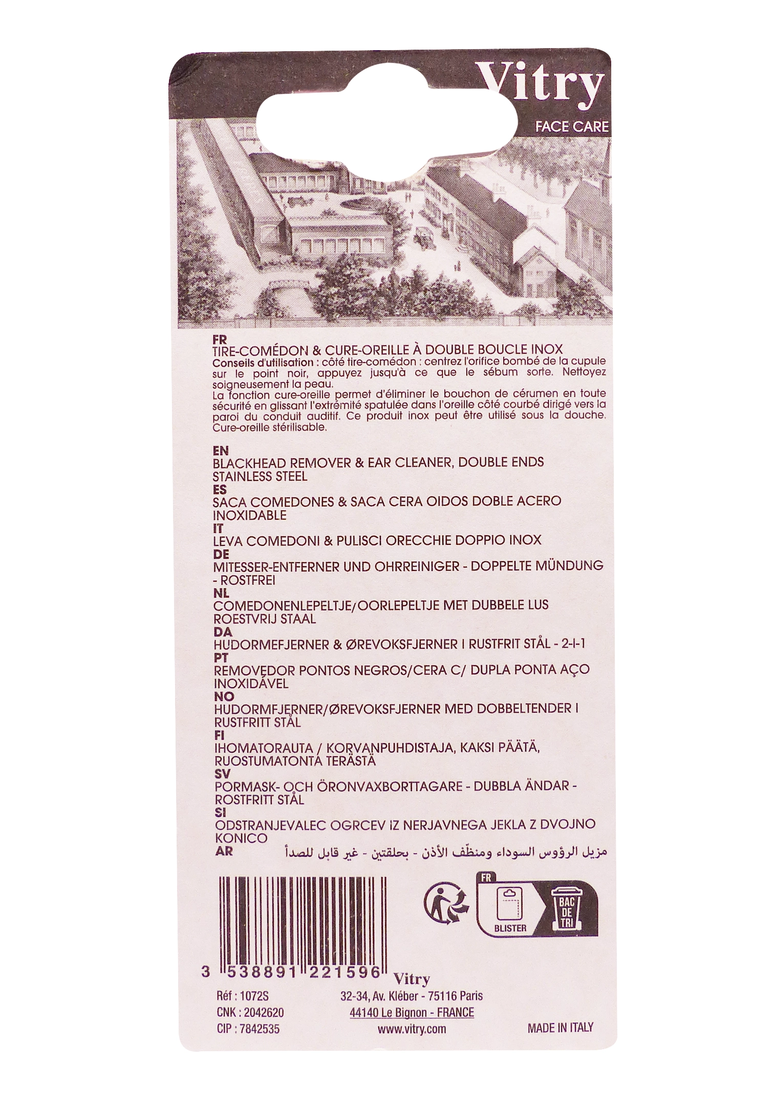Vitry tire-comédon & cure-oreille est un accessoire double embout en acier inoxydable monobloc de 9 cm, conçu pour deux usages précis : extraction hygiénique des points noirs et nettoyage sûr des conduits auditifs. L’extrémité tire-comédon avec orifice bombé aspire le sébum des comédons sans irriter la peau, tandis que l’embout spatulé courbe enlève le cérumen en suivant la paroi de l’oreille sans risque pour le tympan. Stérilisable et garanti à vie, ce produit made in France remplace avantageusement les cotons-tiges et outils jetables pour une hygiène optimale du visage et des oreilles.